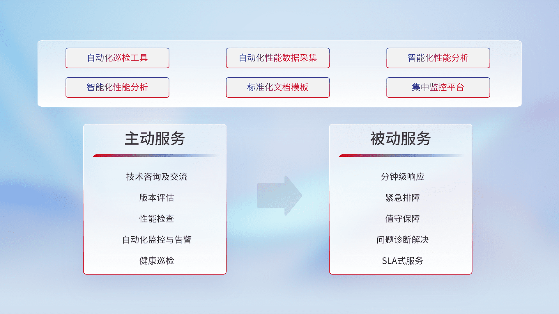 智能化工具和标准化文档,,保障服务质量,,,,提供主动服务(包含技术咨询、、、、版本评估、、、性能检查、、、自动化监控与告警、、、、健康巡检)和被动服务包含(分钟级响应、、、、紧急排障、、值守保障、、问题诊断解决、、、SLA服务)。。