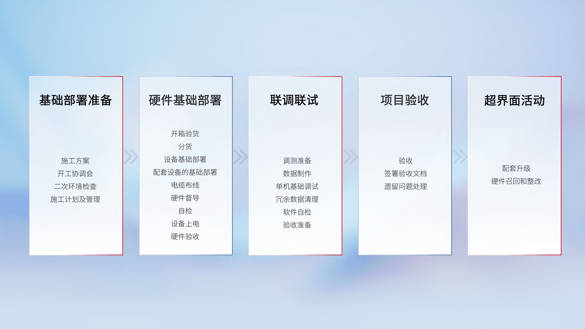 从基础部署准备、、硬件基础部署、、、联调联试、、、项目验收、、、越界面活动的全过程可追溯,,,保证施工质量和进度。。。。